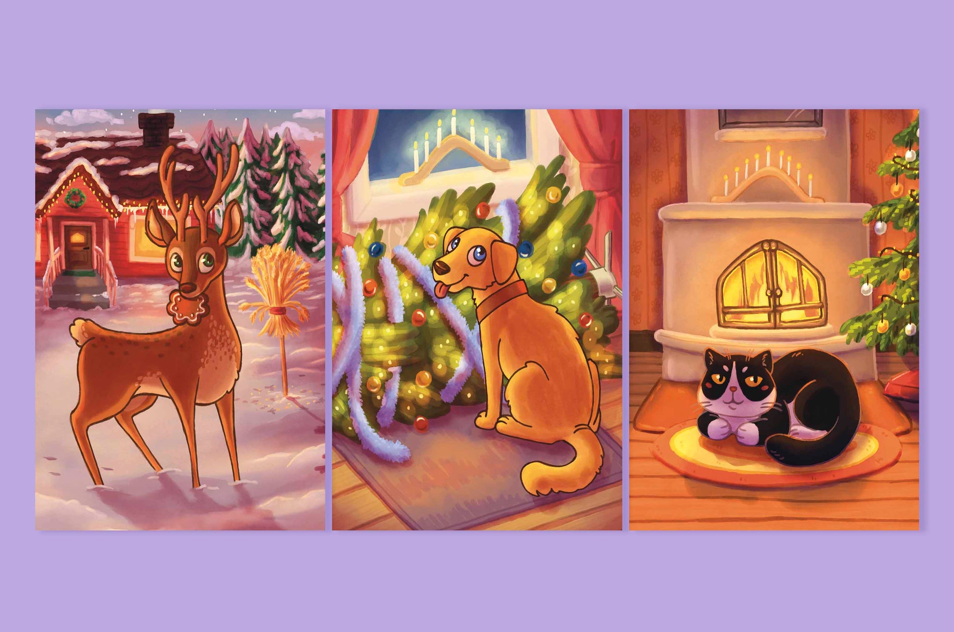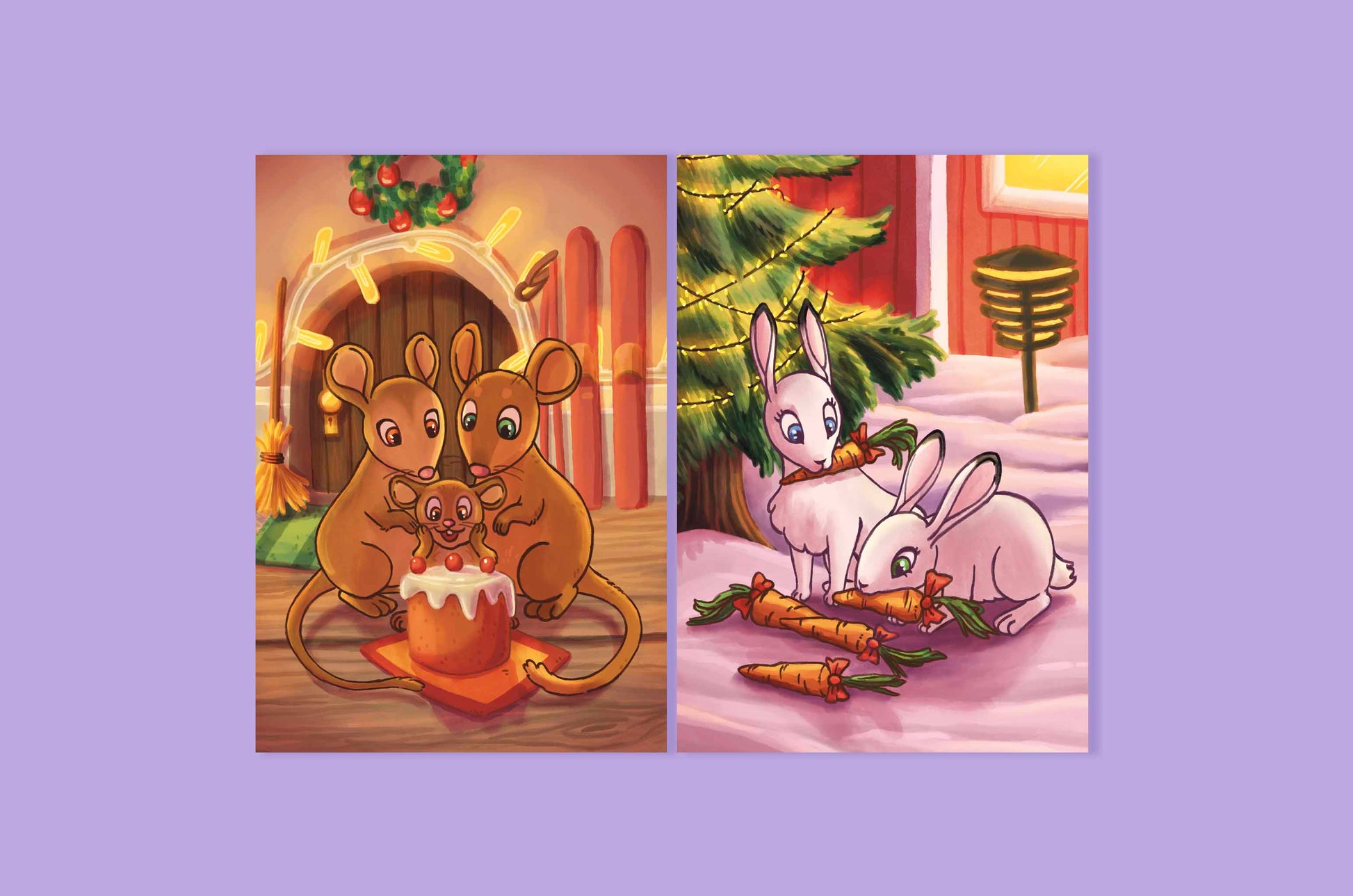 Postikorttisetti sisältää 5 erilaista jouluteemaista korttia. Kortin toisella puolella on viivoitus lähettämistä varten. Korteissa ei ole toivotustekstejä, joten voit itse kirjoittaa joulun toivotukset halutessaan tai käyttää kortteja muuhun tarkoitukseen.
